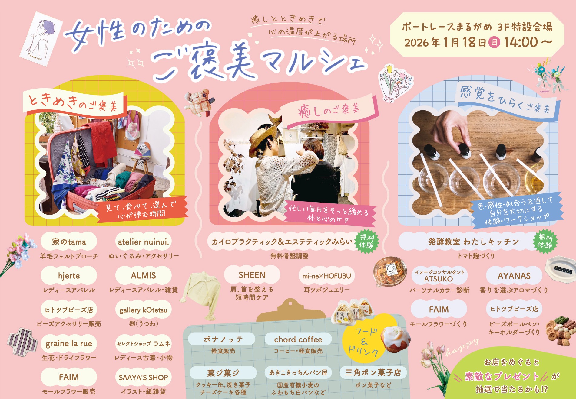 | 内 容 | HAPPY WOMAN MARCHE 女性のためのご褒美マルシェ アロマ、カイロプラクティック、パーソナルカラー体験、ファッション小物、キッズアクセづくり、物販など女性向けの各種ワークショップを実施します。 ※詳細は下記、関連リンクをご覧ください。 HAPPY WOMAN MARCHE 女性のためのご褒美マルシェ |