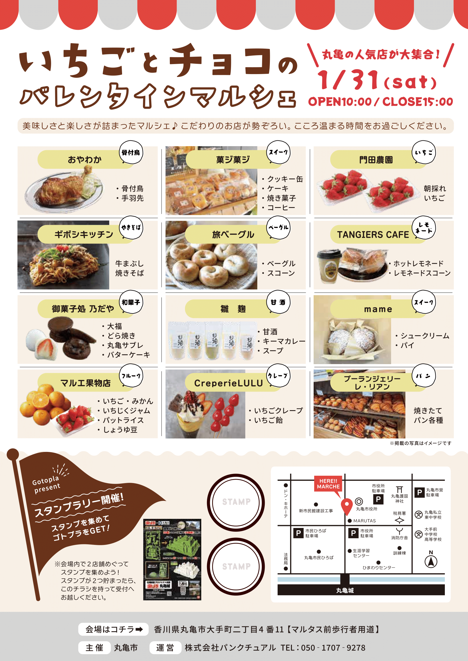 | 内 容 | 「いちごとチョコのバレンタインマルシェ」を開催します! 甘いものを中心に美味しさと楽しさが詰まったマルシェです! 丸亀の人気店が大集合するので、ぜひお越しください! ※詳細は下記、丸亀市公式サイトをご覧ください。 ※丸亀市公式サイト 「いちごとチョコのバレンタインマルシェ」 |