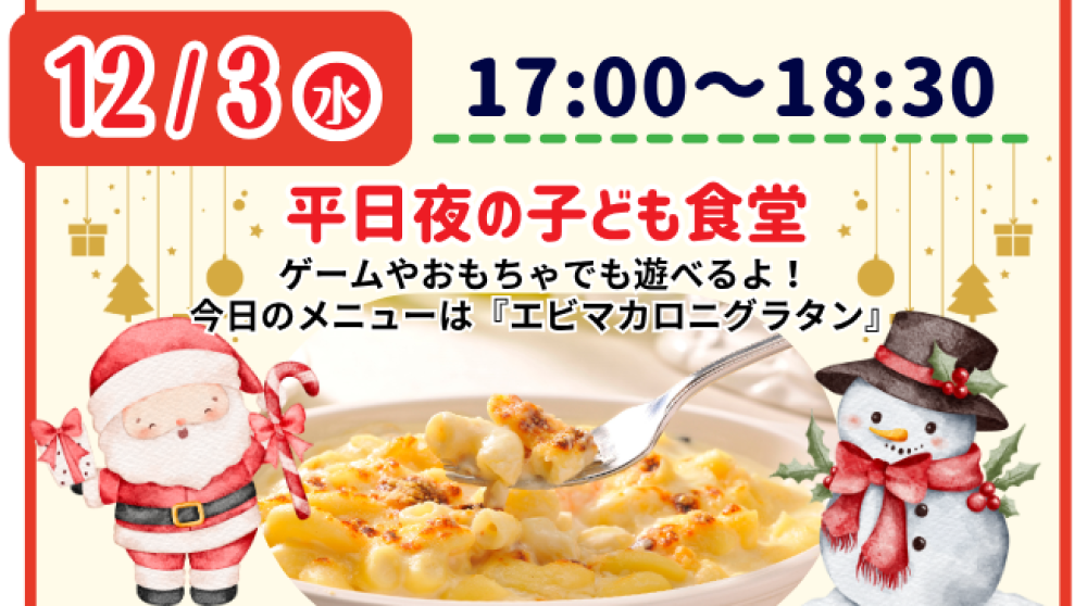 | 内 容 | 12月の色えんぴつ食堂 平日夕方の子ども食堂 🍽️ 晩ご飯を食べながらみんなでワイワイ! メニューは『エビマカロニグラタン』 定員:20名 ▼▽▼▽お申込み等、詳細はこちら▼▽▼▽ https://www.reservestock.jp/randing_pages/show_entry_form/1089079 ~ 2025/12/ 3(水) 17:00まで ※関連リンク ※未来ISSEY Instagram ※未来ISSEY HP |