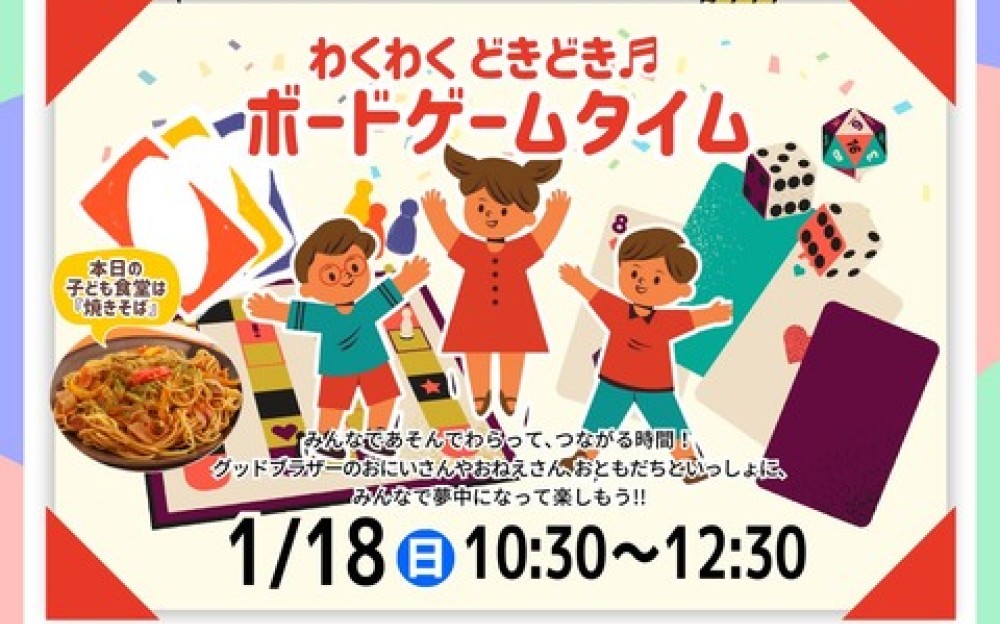 | 内 容 | 1月の色えんぴつ食堂 \ \ わくわく♬ボードゲームタイム / / みんなであそんでわらって、つながる時間! グッドブラザーのおにいさん、おねえさんやおともだちといっしょに、 みんなで夢中になって楽しもう!! 楽しんだ後はみんなで一緒にご飯を食べるよ☆ メニュー:焼きそば 【定員】25名 【申込受付期間】~ 2026/1/18(日) 10:30まで ▼▽▼▽お申込み等、詳細はこちら▼▽▼▽ https://www.reservestock.jp/randing_pages/show_entry_form/1099681 ※関連リンク ※未来ISSEY Instagram ※未来ISSEY HP |