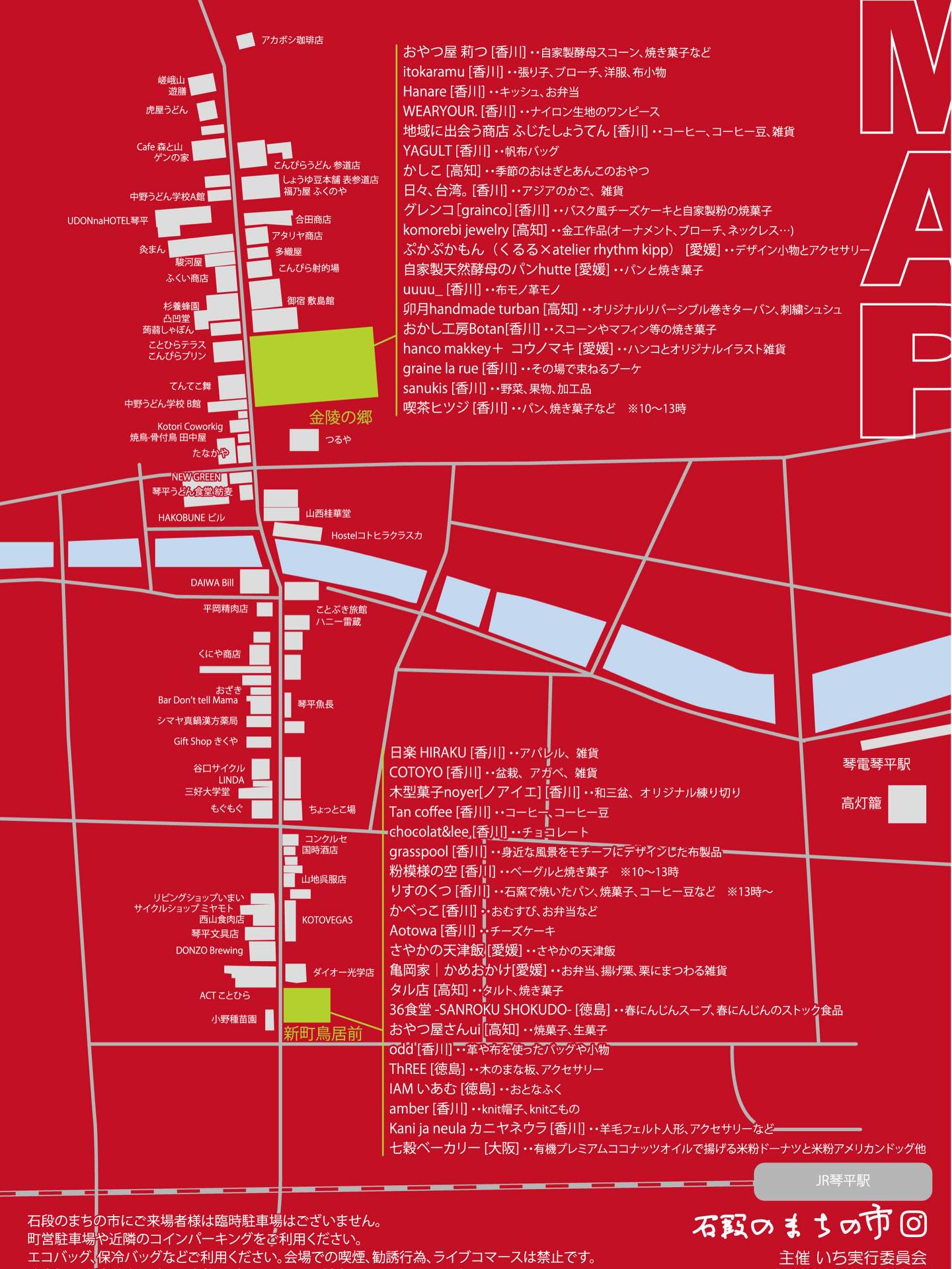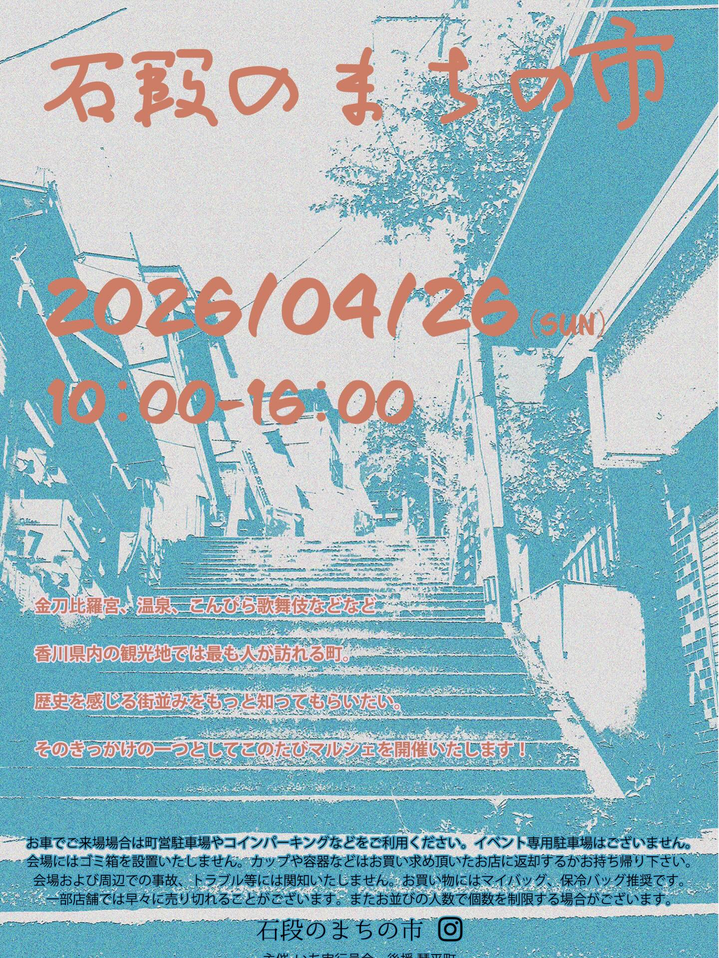 4月262026 石段のまちの市 その他 日 時 4月26日(日) 10:00〜16:00 場 所 金陵の里 会場 香川県仲多度郡琴平町623 参加費 無料 内 容 石段のまちの市 初の琴平での開催【石段のまちの市】です。 観光地としては誰もが知る琴平ですが、街をあるくと面白い店や路地がたくさんあり、もっと県内や近県の方々が気楽に訪れるようなことをしてみたいなと考え企画致しました。 また順次情報をお知らせしてまいります。(石段のまちの市Instagramより) ※お店の紹介など、詳細は下記関連リンクをご覧ください。 石段のまちの市 (Instagram) 問い合わせ いち実行委員会 石段のまちの市 (Instagram)