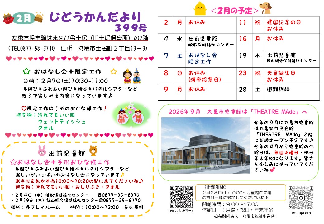 | 内 容 | ~おはなし会&限定工作~ 絵本やふれあい遊び、パネルシアターなど💛 親子で楽しい時間を過ごしましょう! 工作は手形のおひな様🎎 汚れても大丈夫な服装でお越しくださいね。 ●対象:どなたでも ●持ち物:汚れてもいい服、ウェットティッシュ、タオル ********** ※今年の4月から休館日が変わります。 火曜日・祝日・年末年始になりますのでよろしくお願い致します。 ********** ※関連リンク 児童館だより1月号 |