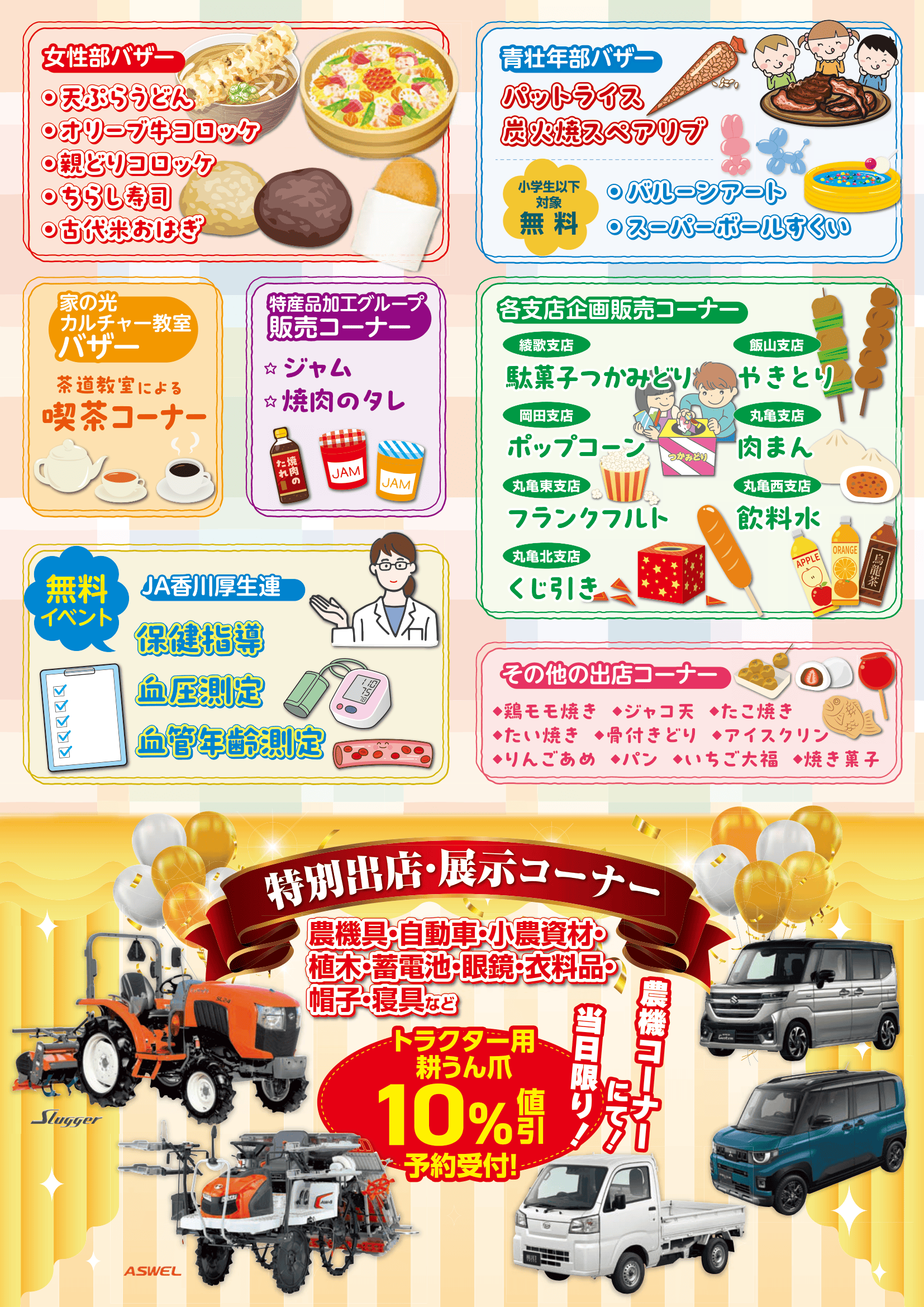 | 内 容 | 丸亀統括ふれあい祭り JA香川県は、地域の組合員の皆さまに日ごろの感謝を込めて「JAふれあいまつり」を開催しています。 3月7日(土)は「丸亀統括ふれあい祭り」を丸亀市綾歌総合文化会館アイレックスで開催いたします。 お近くの皆さまはぜひ、ご来場ください! ※丸亀統括ふれあい祭り (PDF) イベント内容や会場内地図など決定次第、随時情報を公開いたします。 ↓↓↓ ※関連リンク 丸亀統括ふれあい祭り |