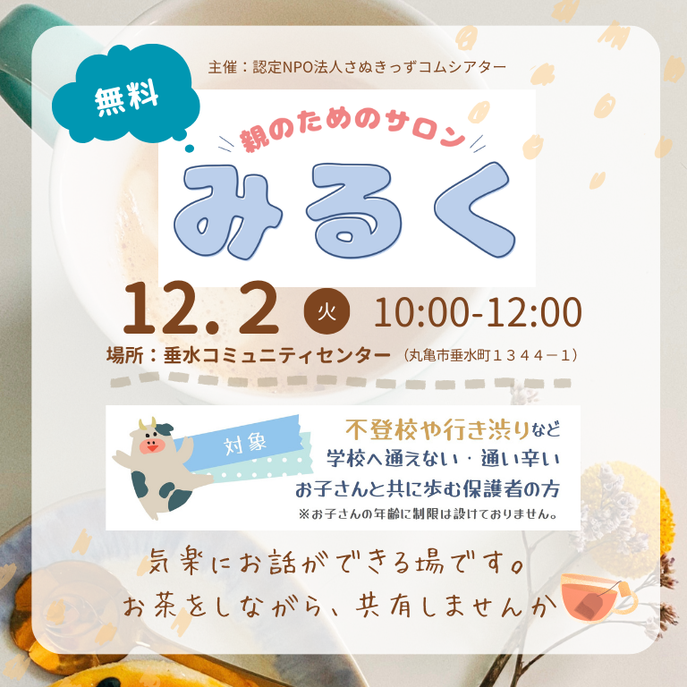| 内 容 | ”親のためのサロン” みるく 対象:不登校や行き渋りなど学校へ通えない·通い辛いお子さんと共に歩む保護者の方 ※お子さんの年齢に制限は設けておりません。 気楽にお話ができる場です。 お茶をしながら、共有しませんか🌸 主催:認定NPO法人さぬきっずコムシアター ※関連リンク さぬきっずコムシアター ”親のためのサロン” みるく |