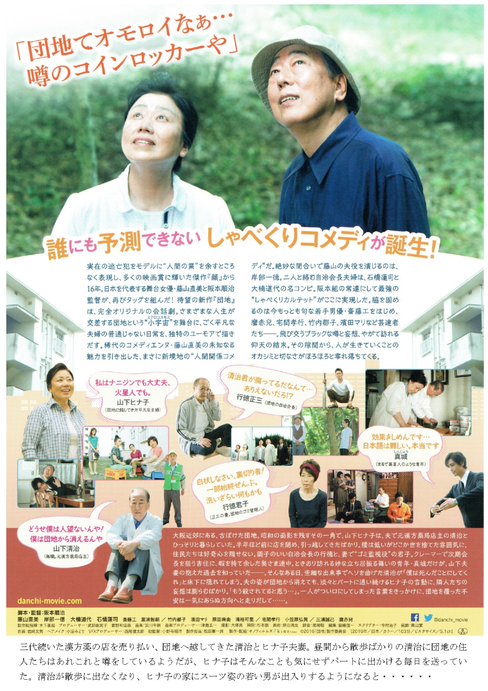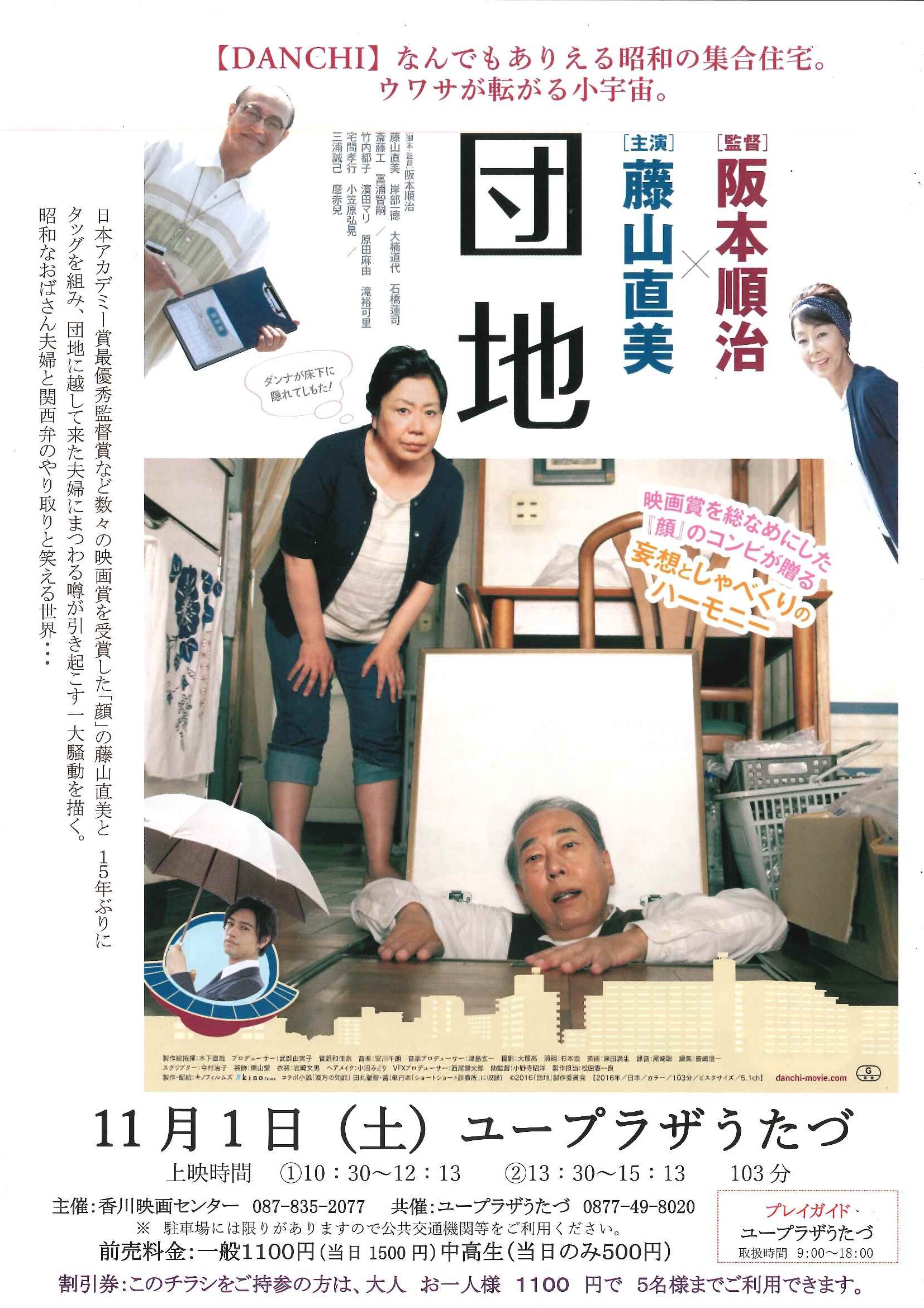 | 内 容 | 映画上映会「団地」 11月1日(土)にハーモニーホールで映画「団地」を上映します。 さまざまな人生が交差する団地という『小宇宙』を舞台に、ごく平凡な夫婦の普通じゃない日常を独特のユーモアで描きだす新境地の人間関係コメディ。 チケットはユープラザうたづ事務所で好評販売中です。 **************************** 主演、藤山直美。さまざまな人生が交差する団地という『小宇宙』(ミクロコスモス)を舞台に、ごく平凡な夫婦の普通じゃない日常を独特のユーモアで描きだす新境地の人間関係コメディ。 三代続いた漢方薬の店を売り払い、団地へ越してきた清治とヒナ子夫妻。昼間から散歩ばかりの清治に団地の住人達はあれこれと噂しているようだが、ヒナ子はそんなことも気にせずパートに出かける毎日を送っていた。清治が散歩に出なくなりヒナ子の家にスーツ姿の若い男が出入りするようになると… **************************** ※映画上映会「団地」(チラシ) ※詳細 映画上映会「団地」 |