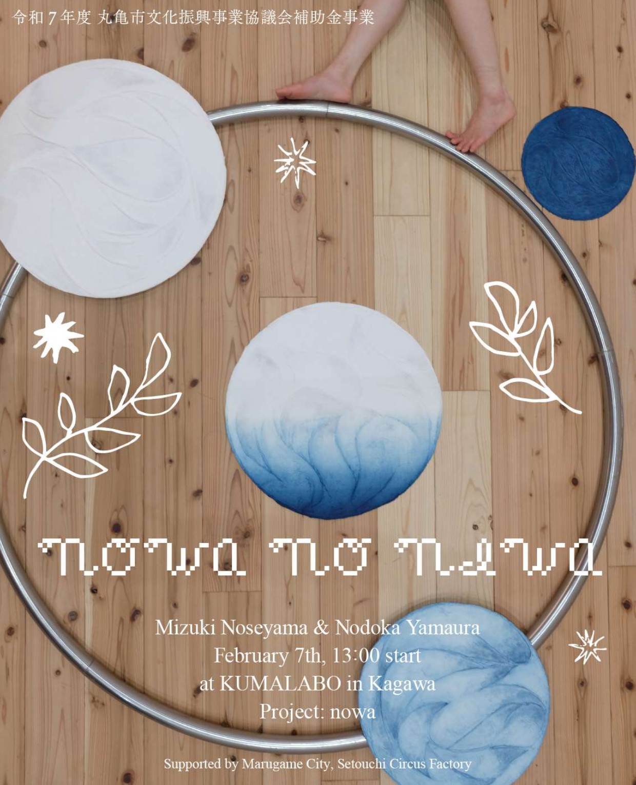 | 内 容 | 和紙×現代サーカス公演「nowa no niwa」を開催します 丸亀市文化振興事業協議会では、新たな文化芸術の価値を創造する「芸術創造事業」に対し補助金を交付しています。 このたび、今年度の補助事業として採択された、和紙作家・山浦のどか氏による 和紙×現代サーカスのインスタレーションパフォーマンス公演を開催します。 ぜひご来場ください。 ※インスタレーション…特定の場所にオブジェや装置を設置し、その空間全体を作品として体験させる「空間・体験型」の芸術手法 演出・出演:山浦のどか、野瀬山瑞希 ************************* 目の前に広がる庭。 静けさの中から目をそっとひらき、あかるさを迎えると、なにかが芽吹きはじめる。 丸い形がころころ、ゆらゆら、ふわり。 和紙とシルホイールの円、そしてわたしたちの身体の動きを通して、 庭はまるで春を迎えるかのような芽吹きの気配に包まれていく。 交差する素材たちが生み出す世界は、余白と影。 いくつもの庭の景色が溶け合い、 ひとつの「いま(now)」が描き出される。 ************************* 協力:瀬戸内サーカスファクトリー 、(株)山一木材 企画:nowa 助成:丸亀市文化振興事業協議会 ※詳細はチラシ・関連リンクをご覧ください。 チラシ [PDFファイル/143KB] ※丸亀市公式サイト |