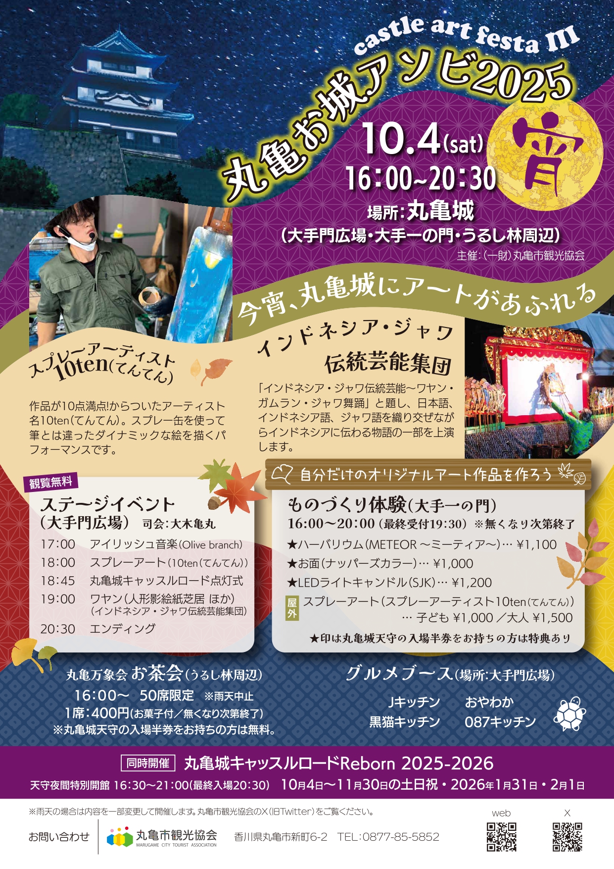| 問い合わせ | (一財)丸亀市観光協会 0877-85-5852 ※雨天の場合は内容を一部変更して開催します。丸亀市観光協会のX(旧Twitter)をご覧ください。 ⇒丸亀市観光協会 X |