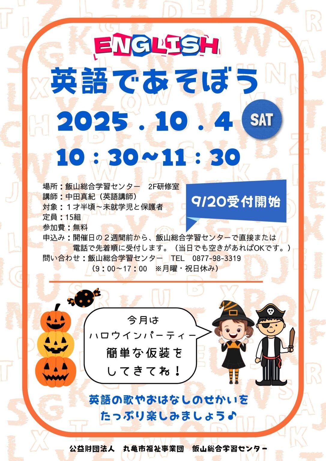 | 内 容 | 親子で一緒に、英語のうたやおはなしの世界をたっぷり楽しみましょう!! ●講師:中田 真紀さん(英語講師) ●対象:1歳半~未就学児と保護者 (要予約15組) 開催日の2週間前(9/20)から、飯山総合学習センターで直接または電話で先着順に予約受付します。 (当日でも空きがあればOKです。) ※英語であそぼう(チラシ) ※関連リンク 飯山総合学習センター |