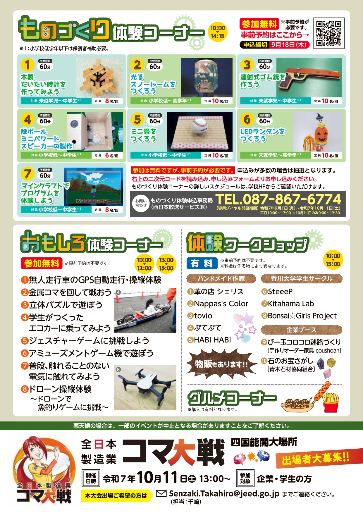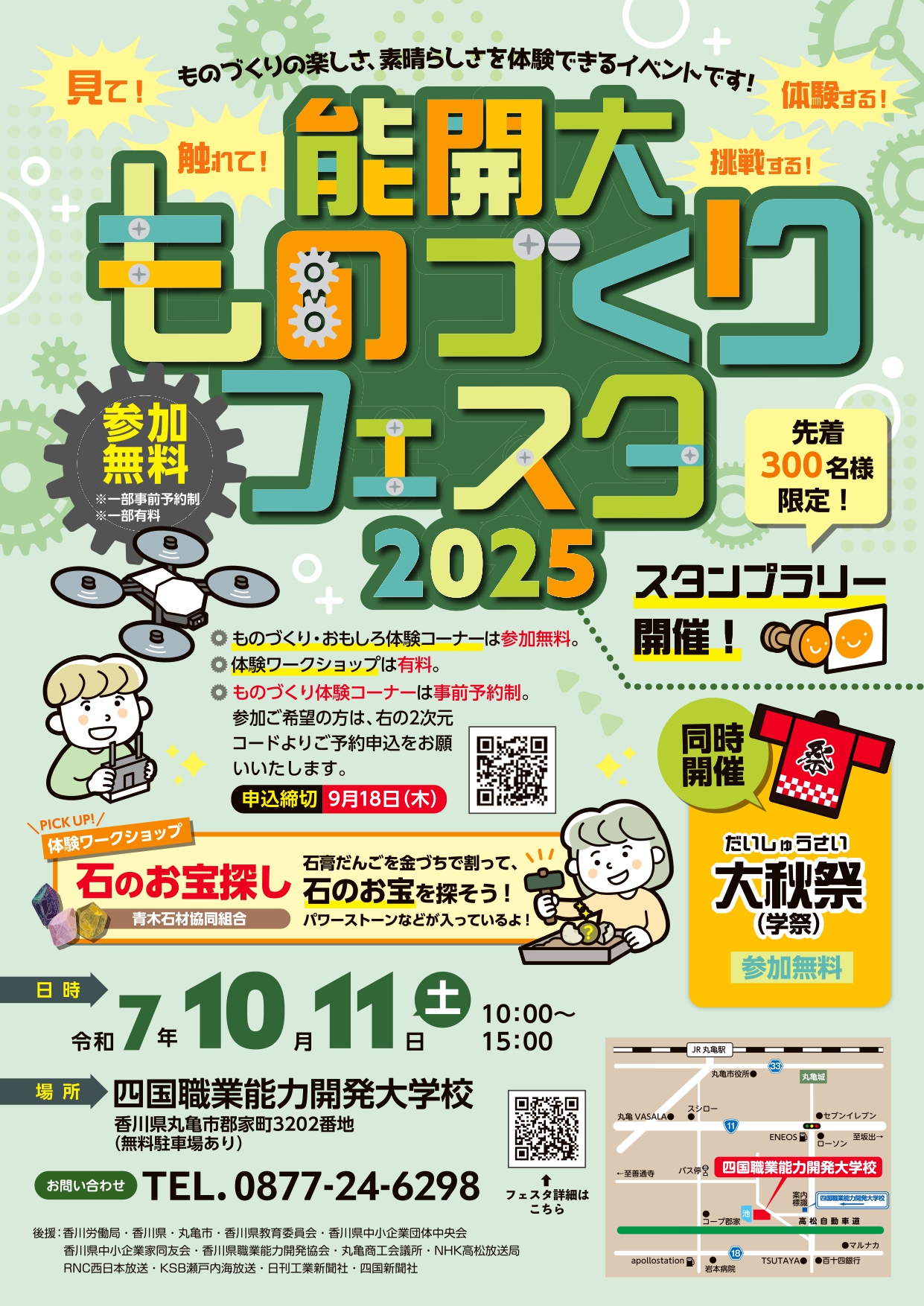 | 内 容 | 能開大ものづくりフェスタ 〇ものづくり体験コーナー(※事前予約) 〇おもしろ体験コーナー(予約不要) 〇体験ワークショップ (予約不要・有料) ・ハンドメイド作家(革の店 シェリス 、Nappas’s Color 、tovio 、ぷてぷて 、HABI HABI) ・香川大学学生サークル(SteeeP 、Kitahama Lab 、Bonsai☆Girls Project) ・手作りオーダー家具 coushoan 「びー玉コロコロ迷路づくり」 ・青木石材協同組合「石のお宝探し」 ※「ものづくり体験コーナー」は事前予約制となります。 申込みはこちら(外部リンク Googleform) 【事前予約に関する注意事項】 ・お申込み期限は、2025年9月1日(月)から9月18日(木)となります。 ・お申し込みはお一人様につき、第1希望・第2希望・第3希望まで選択できます。 ・ただし、同一体験イベントでの複数申込はご遠慮ください。 ・お申込み多数の場合は、抽選となります。 ・抽選結果については、当選ハガキの発送をもってかえさせていただきます。 ・落選された方にはご連絡いたしませんので、ご了承ください。 ・当選はがきは、9月26日(金)ごろに事務局より発送予定です。 ※リーフレットはこちら ※イベントスケジュールはこちら ※会場マップはこちら ※関連リンク 能開大ものづくりフェスタ |