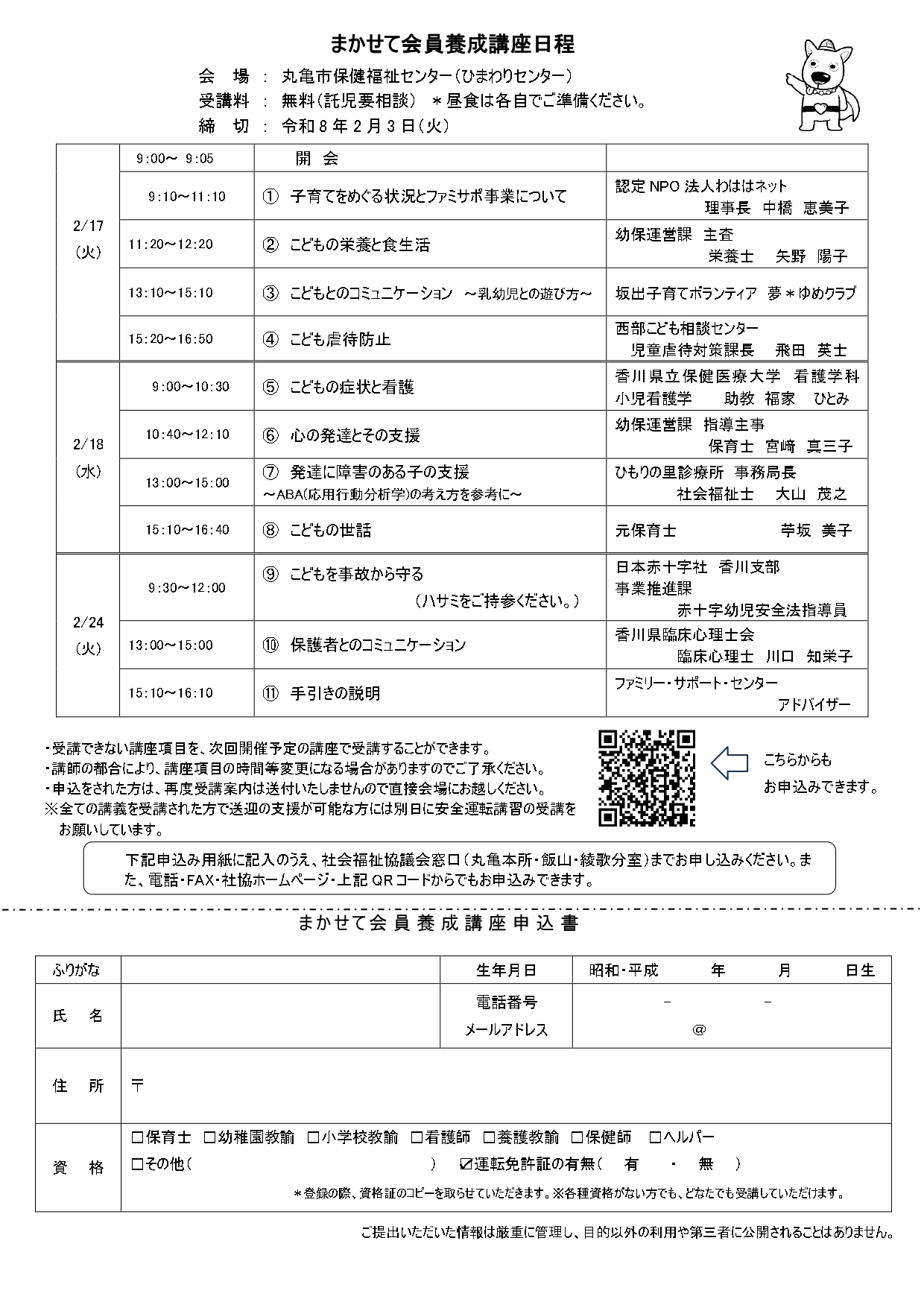 | 内 容 | 第2回まかせて会員養成講座開催します 令和8年2月17日(火)・18日(水)・24日(火)の3日間、まかせて会員養成講座を開催します。 ●受講できない講座項目を、次回開催予定の講座で受講することができます。 ●講師の都合により、講座項目の時間等変更になる場合がありますのでご了承ください。 ●申込をされた方は、再度受講案内は送付いたしませんので直接会場にお越しください。 ※全ての講義を受講された方で送迎の支援が可能な方には別日に安全運転講習の受講をお願いしています。 Webお申し込み→こちら メールアドレスQRコード→こちら LINEでも情報発信をしています→こちら また、電話·FAX·社協ホームページからでもお申込みできます。 ●締切:令和8年2月3日(火) ★まかせて会員とは…★ ◎対象 〇丸亀市内在住・在勤の18歳以上の人 〇心身ともに健康で子育ての援助を行いたい人 〇当センターが行う「まかせて会員養成講座」を修了した人 ※ちらし裏面【詳しい日程はこちらをご覧ください】 ※関連リンク 第2回「まかせて会員養成講座」のお知らせ |