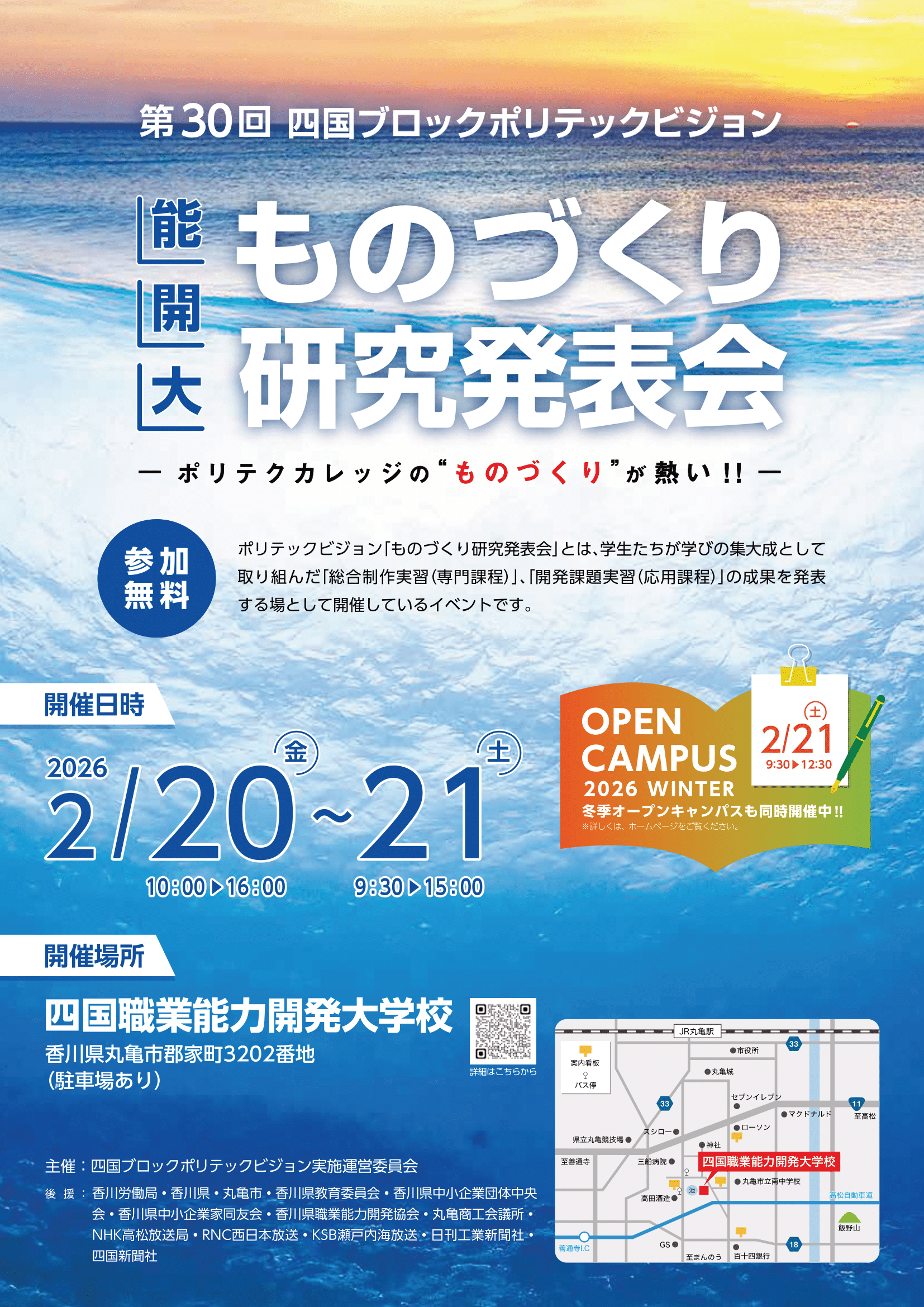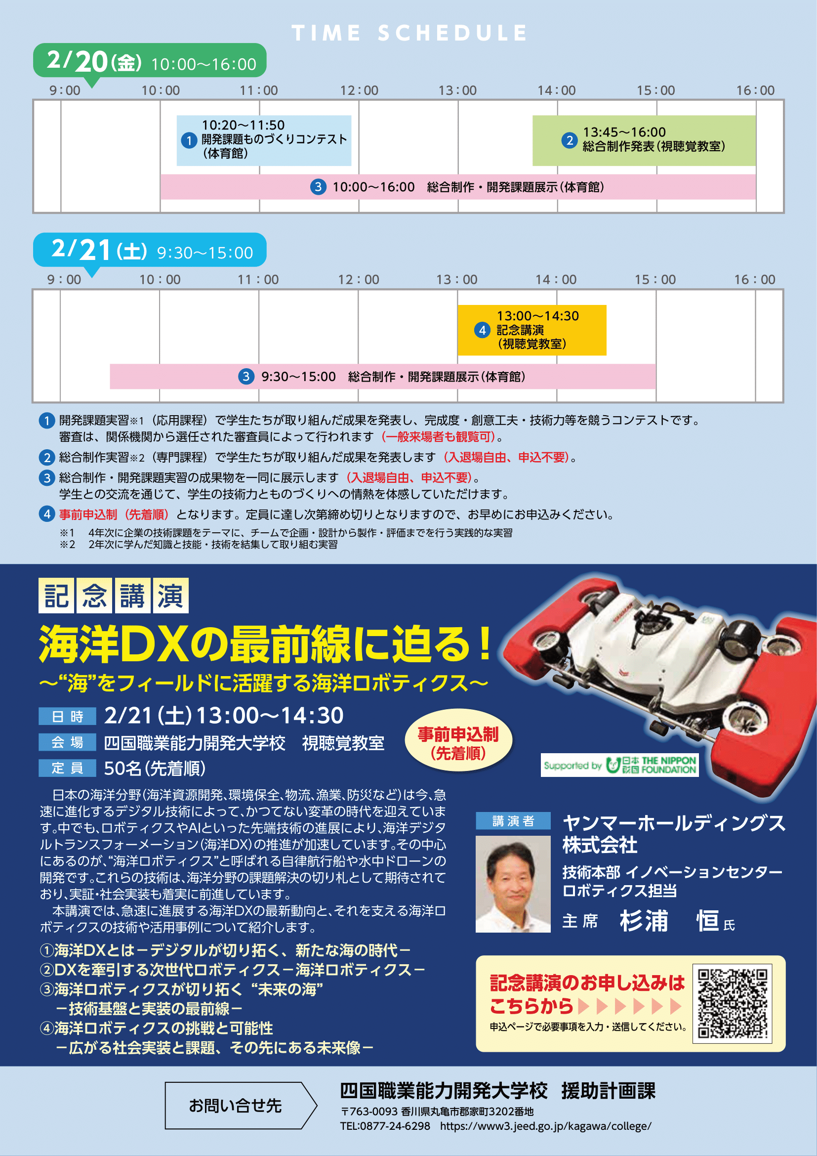 | 内 容 | 第30回四国ブロックポリテックビジョン 能開大ものづくり研究発表会開催のご案内 専門課程総合制作展示・発表、応用課程開発課題展示・発表、 【記念講演】 「海洋DXの最前線に迫る!~”海”をフィールドに活躍する海洋ロボティクス~」 講師:ヤンマーホールディングス株式会社 技術本部 イノベーションセンター ロボティクス担当 主席 杉浦 恒氏 ※記念講演の注意事項 ・本講演は対面形式となります(会場は当校)。 オンラインでの配信は行いません。 ・先着50名(事前申込制)。参加費は無料です。 ・参加を希望される方は申込フォームよりお申し込みください。 ・記念講演申込フォームについてはこちら<外部リンク(Microsoft Forms> ・お申込みの締め切りは令和8年2月13日(金)です。 能開大ものづくり研究発表会チラシはこちら 2月21日(土)冬のオープンキャンパス(修了製作見学会)も同時開催予定です。 ※四国職業能力開発大学校 HP |