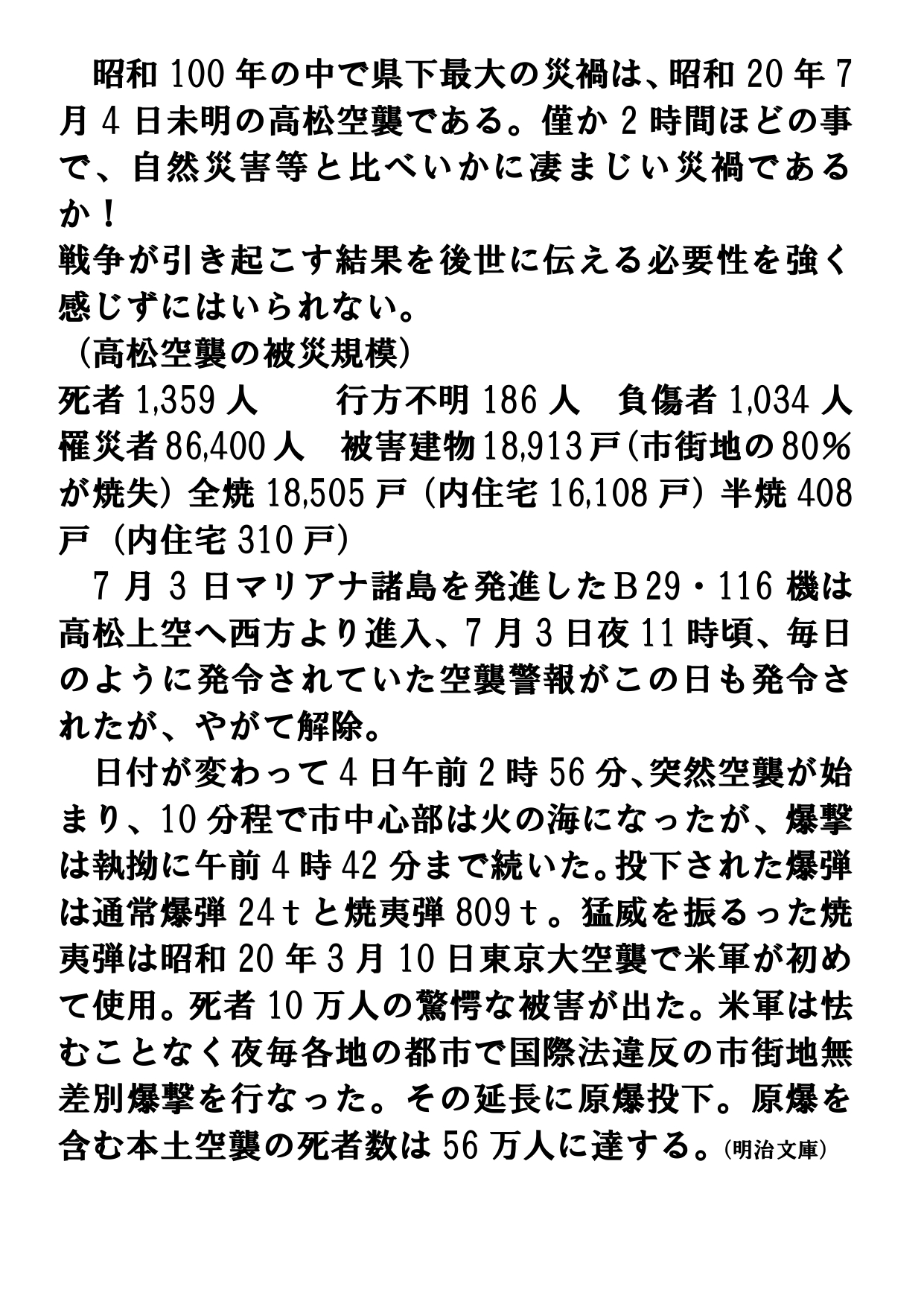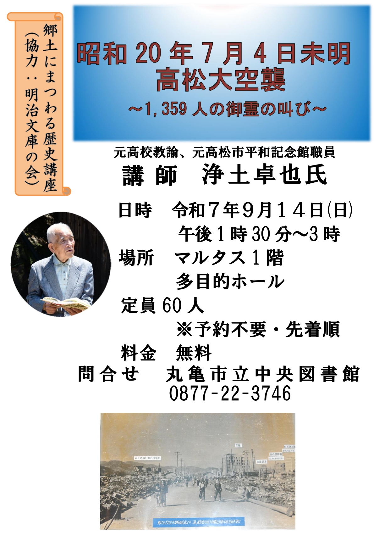 『郷土にまつわる歴史講座』を開催します。「昭和20年7月4日未明 高松大空襲 ~1,359人の御霊の叫び~」※市内の高校生が紙芝居を朗読します。