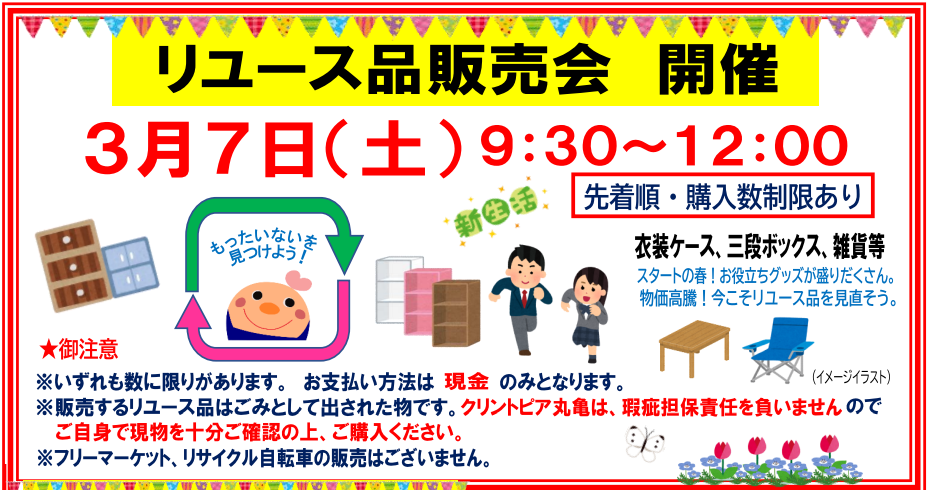 | 内 容 | リユース品販売会 開催 先着順・購入数制限あり 衣装ケース、三段ボックス、雑貨等 スタートの春!お役立ちグッズが盛りだくさん。物価高騰! 今こそリユース品を見直そう! ★御注意 ※いずれも数に限りがあります。 お支払い方法は現金のみとなります。 ※販売するリユース品はごみから出された物です。 クリントビア丸亀は、瑕疵担保責任を負いませんので御自身で現物を十分御確認の上、御購入ください。 ※フリーマーケット、リサイクル自転車の販売はございません。 ************* ※詳細は下記PDF,または関連リンクをご覧ください。 エコ丸通信R8.3月(PDF) ※関連リンク クリントピア丸亀 |