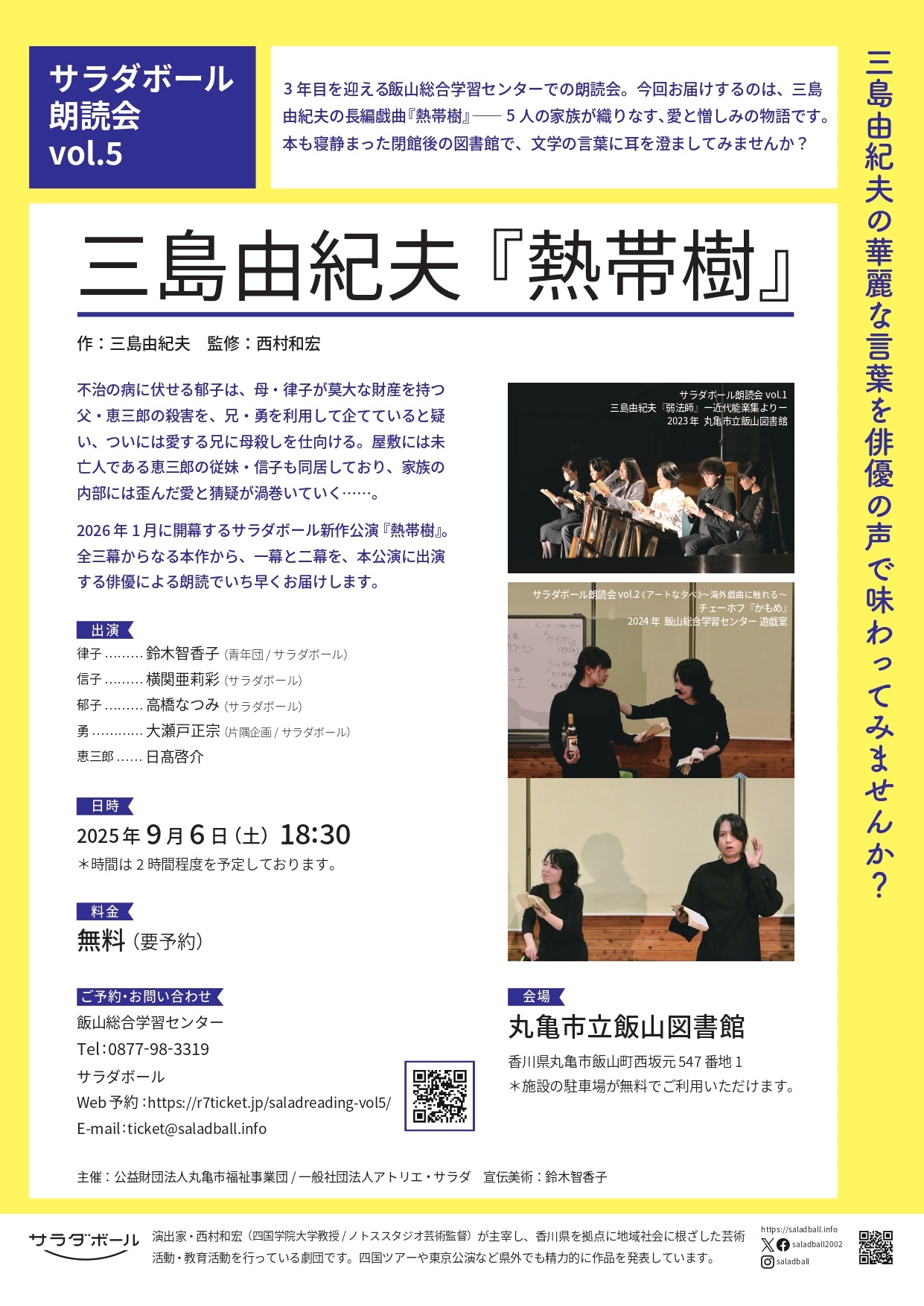 演出家、西村和宏が主宰する香川県を拠点に活動している劇団「サラダボール」による、三島由紀夫の戯曲『熱帯樹』の朗読会