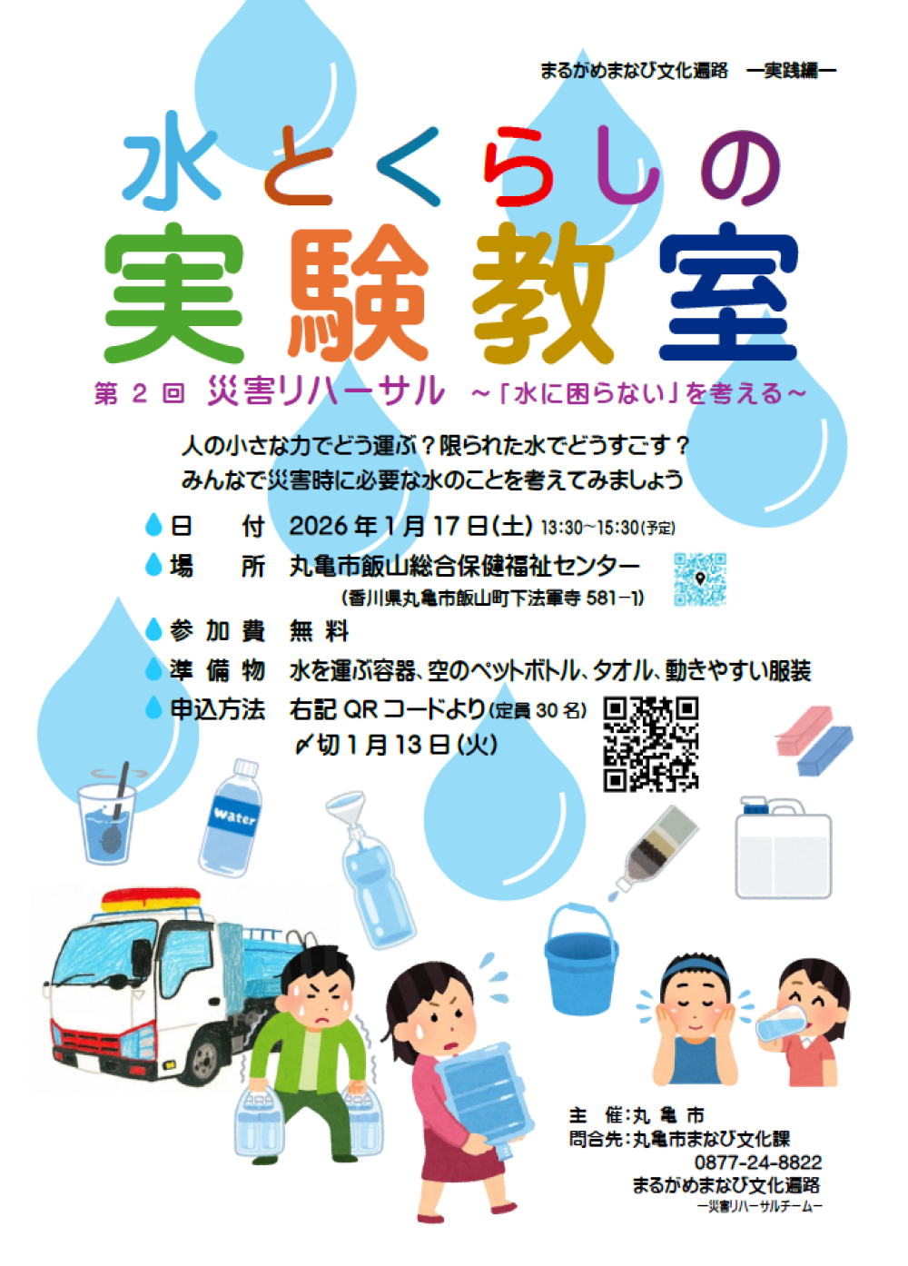 | 内 容 | 災害リハーサル「水に困らない」を考える 「まるがめまなび文化遍路」は参加者が自ら企画・運営する講座を通して地域に根ざした「まなび」が広がり深まることを目的としています。 市民が主体となって企画した講座として、「水の備え」をテーマにした体験型教室を開催します。実験やクイズを交えて、災害時に必要な水の量や使い方について楽しく学びましょう。 【定員】30名 【準備物】 準備物・水を運ぶ容器・空のペットボトル・タオル(手を拭く用) ・動きやすい服装(濡れるかもしれません) 【注意事項】 ・実験の際に、カッターなどを使用してペットボトルを加工します。 ・記録の為に講座の様子を撮影します。 【申込方法】 下記URLもしくはチラシQRコードより 〆切 1月13日(火曜日) https://x.gd/Td49U<外部リンク> 災害リハーサル「水に困らない」を考える(PDF) ※関連リンク 災害リハーサル「水に困らない」を考える |