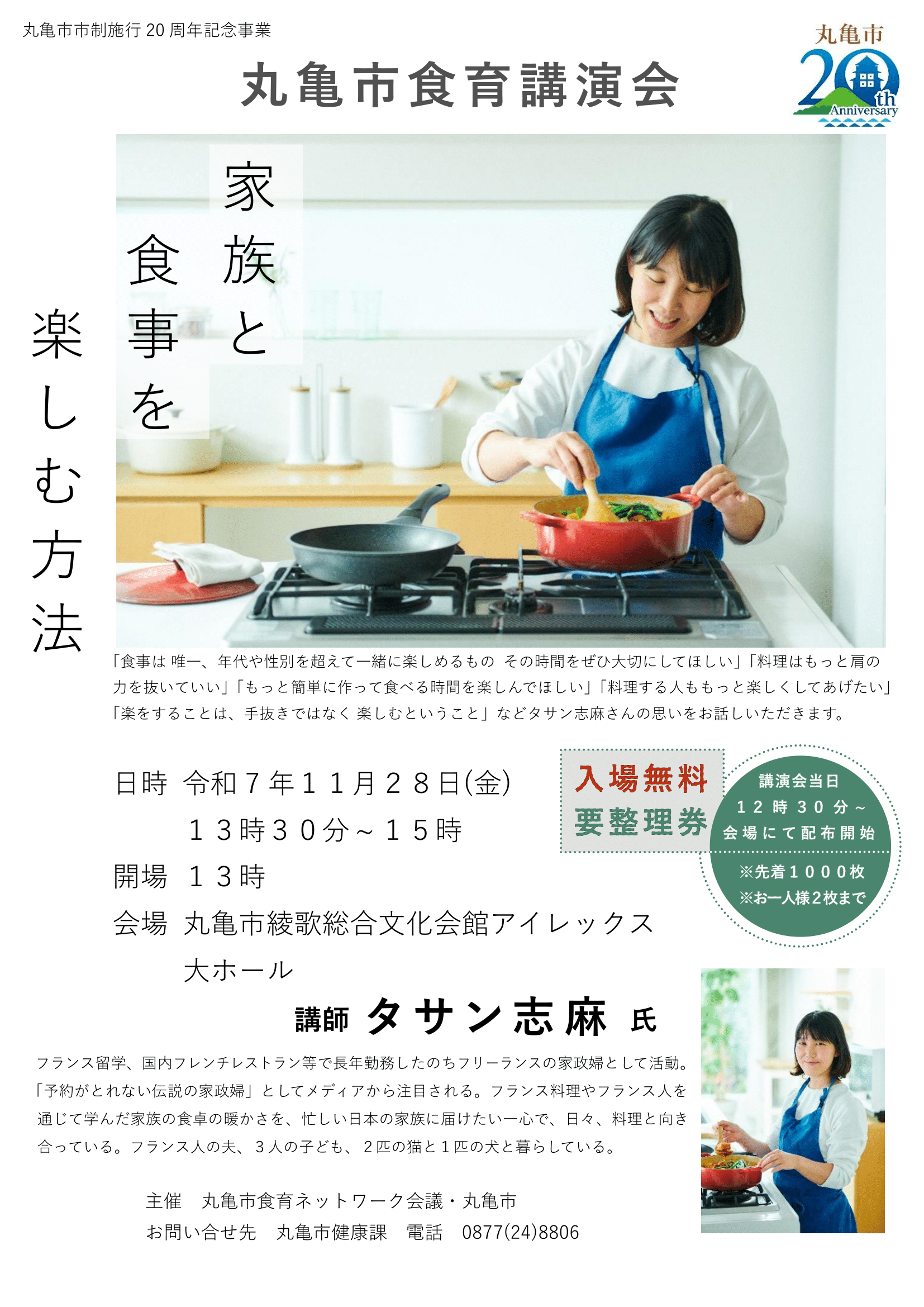 | 内 容 | 丸亀市食育講演会 家族と食事を楽しむ方法 「食事は 唯一、年代や性別を超えて一緒に楽しめるもの その時間をぜひ大切にしてほしい」「料理はもっと肩の力を抜いていい」「もっと簡単に作って食べる時間を楽しんでほしい」「料理する人ももっと楽しくしてあげたい」「楽をすることは、手抜きではなく 楽しむということ」などタサン志麻さんの思いをお話しいただきます。 ************* 【申込み】講演会当日 12時30分~会場にて配布開始 ※先着1000枚 ※お一人様2枚まで 【講師】タサン志麻 氏 フランス留学、国内フレンチレストラン等で長年勤務したのちフリーランスの家政婦として活動。 「予約がとれない伝説の家政婦」としてメディアから注目される。フランス料理やフランス人を 通じて学んだ家族の食卓の暖かさを、忙しい日本の家族に届けたい一心で、日々、料理と向き 合っている。フランス人の夫、3人の子ども、2匹の猫と1匹の犬と暮らしている。 ※丸亀市食育講演会 家族と食事を楽しむ方法(チラシ) |