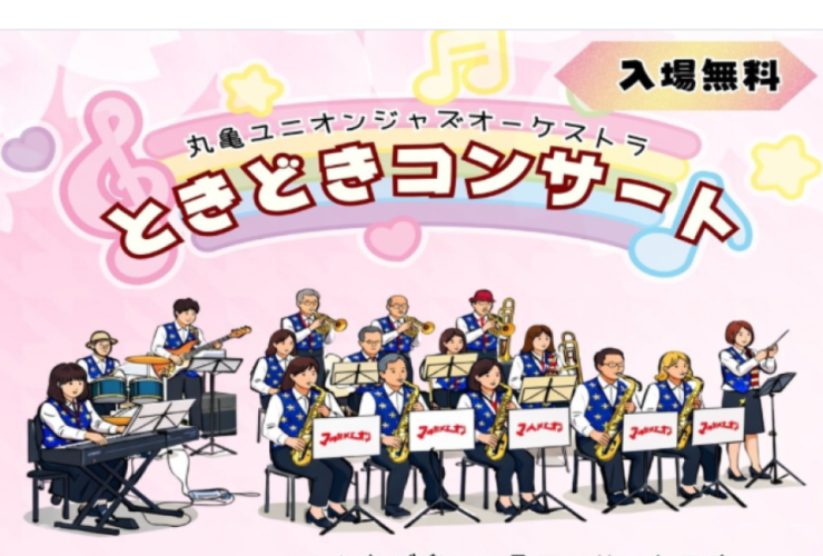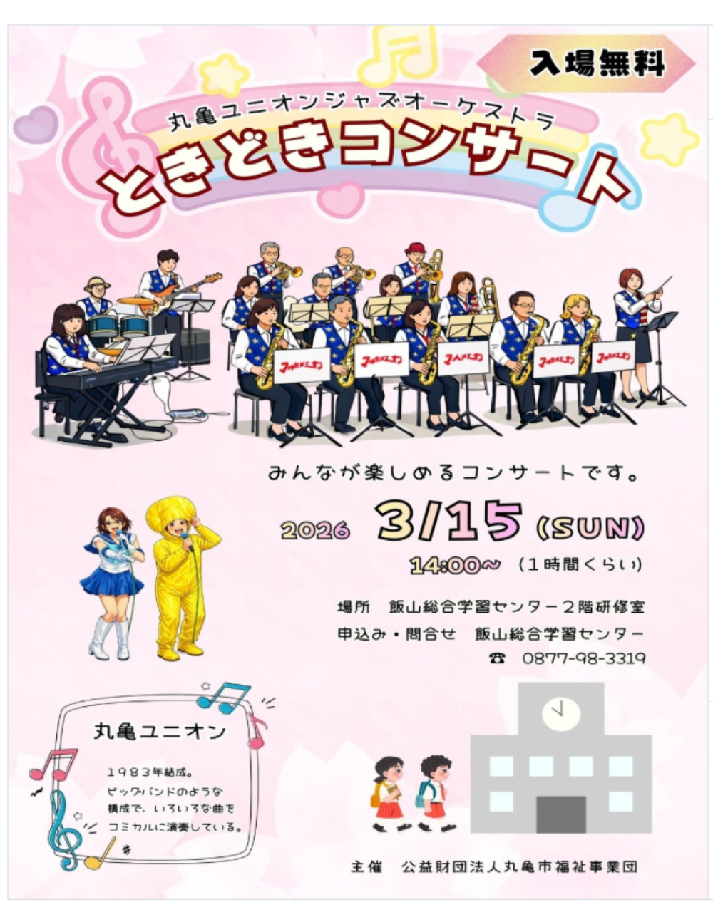 | 内 容 | 🎵ときどき?コンサート🎵 丸亀ユニオンによる、みんなが楽しめるコンサートです。 いろんな曲をコミカルに演奏! 丸亀ユニオンは1983年に結成、ビッグバンドのような構成です。 赤ちゃんから大人までみんなで楽しみましょう! 【主 催】公益財団法人丸亀市福祉事業団 【申し込・問合せ】 丸亀市飯山総合学習センター Tel:0877-98-3319 |