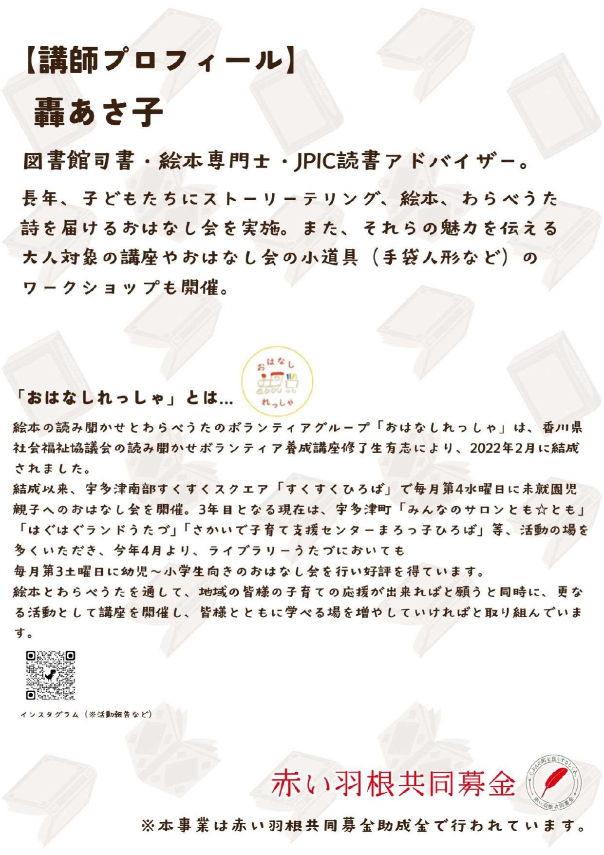 | 内 容 | 『昔話の魅力』~ストーリーテリングの経験から~ 絵本読み聞かせとわらべうたのボランティアグループ「おはなしれっしゃ」様の主催、ライブラリーうたづの共催で絵本講座を開催いたします。 昔話の魅力についてこども達にたくさんのお話を届けている絵本専門誌の轟あさ子さんがご講演くださいます。子育て中の方をはじめ、保育・教育関係者・読書ボランティア・学生の皆様のご参加等お待ちしております。 【定員】60名 【対象】昔話に興味ある方どなたでも(定員60名)(※託児はありません。) 【講師】轟 あさ子 氏(図書館司書・絵本専門士・JPIC読者アドバイザー) 【申込開始】9月2日(火)9時~ 【申込方法】お電話もしくは窓口で 【受付】ユープラザうたづ(0877-49-8020) 【主催】絵本読み聞かせとわらべうたのボランティアグループおはなしれっしゃ ※「おはなしれっしゃ」様については…公式インスタグラム 【共催】ユープラザうたづ/ライブラリーうたづ ※詳細は関連リンクをご覧ください。 関連リンク ユープラザうたづ |