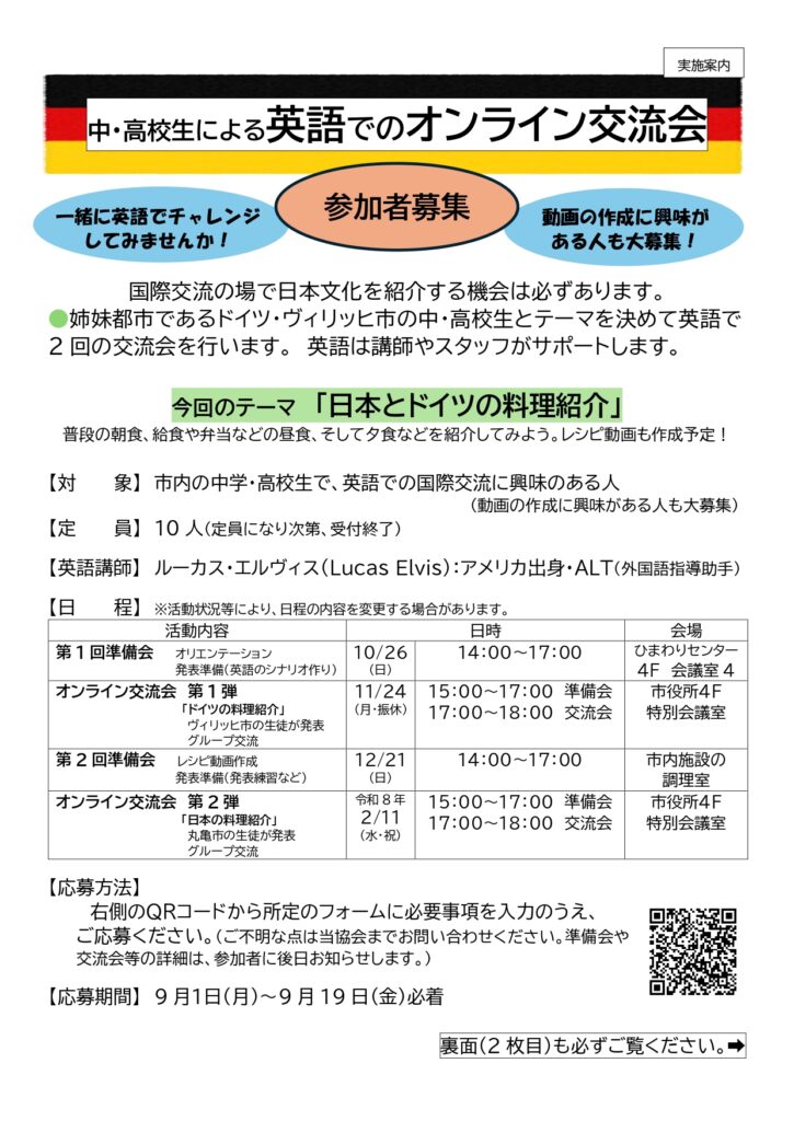 日本とドイツの料理紹介」をテーマに、姉妹都市であるドイツ・ヴィリッヒ市の中・高校生と2回にわたりオンライン交流を行います。講師やスタッフのサポートを受けながら一緒に、英語で楽しくチャレンジしてみませんか。